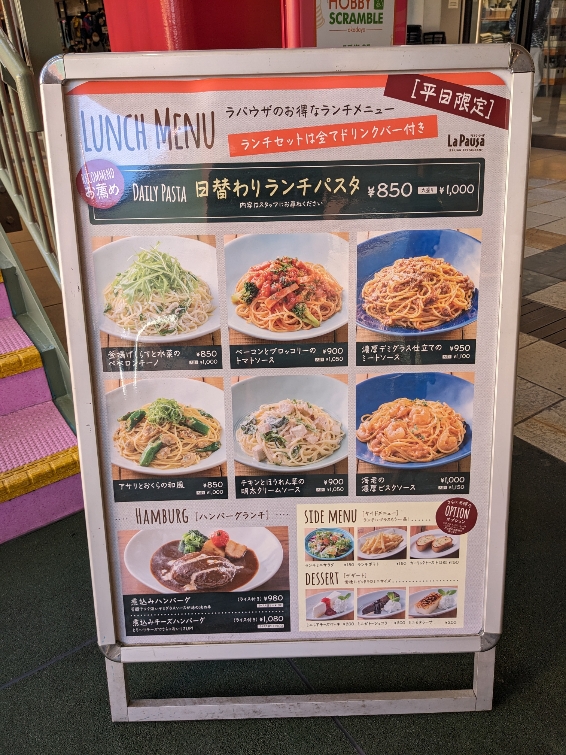 お店前の看板です。 【日替わりランチパスタ】 ●釜揚げしらすと水菜のペペロンチーノ ¥850 ●ベーコンとブロッコリートマトソース ¥900 ●濃厚デミグラスソースのミートソース ¥950 ●アサリとおくらの和風 ¥850 ●チキンとほうれん草の明太クリームソース ¥850 ●海老の濃厚ビスクソース ¥1,000