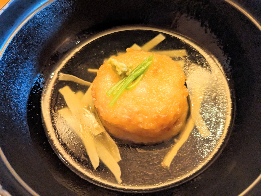 生麩田楽と湯葉揚げです。味噌味の生麩田楽と、塩味の湯葉揚げは好対照で美味しかったです。