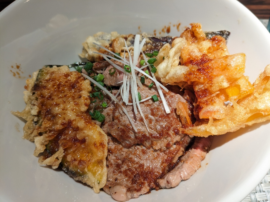 ステーキの他に茄子、かぼちゃ、ニンジンの天ぷらが乗っています。タレが甘めのなのは天ぷらにも合うようにしてあるのかな。