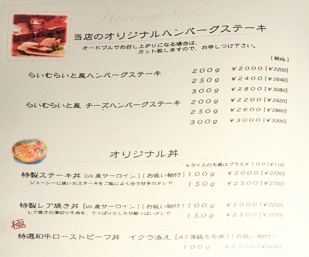 メニューです。 オリジナルハンバーグステーキ ●らいむらいと風ハンバーグステーキ 200g ¥2200 250g ¥2640 300g ¥3080 ●らいむらいと風チーズハンバーグステーキ 200g ¥2420 250g ¥2860 300g ¥3300 オリジナル丼 ●特製ステーキ丼(US産サーロイン) 100g ¥2200 150g ¥2750 ●特製レア焼き丼(US産サーロイン) 100g ¥2200 150g ¥2750 ●特選和牛ローストビーフ丼 イクラ添え 100g ¥4290
