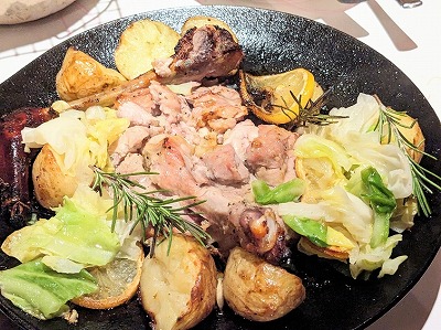 今回は4人だったので、メイン料理を2品選べました。「水郷赤鶏骨付きもも鉄板焼き」です。