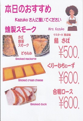 燻製しました。サントリー角瓶、タンカレージン、麦焼酎惣兵衛。10分間の燻製です。お試しください。