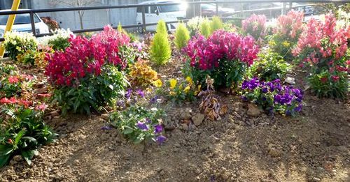 冬の午後、穏やかな陽光の中で、美しい花々が咲いています。洋光台六丁目公園に隣接した花壇。