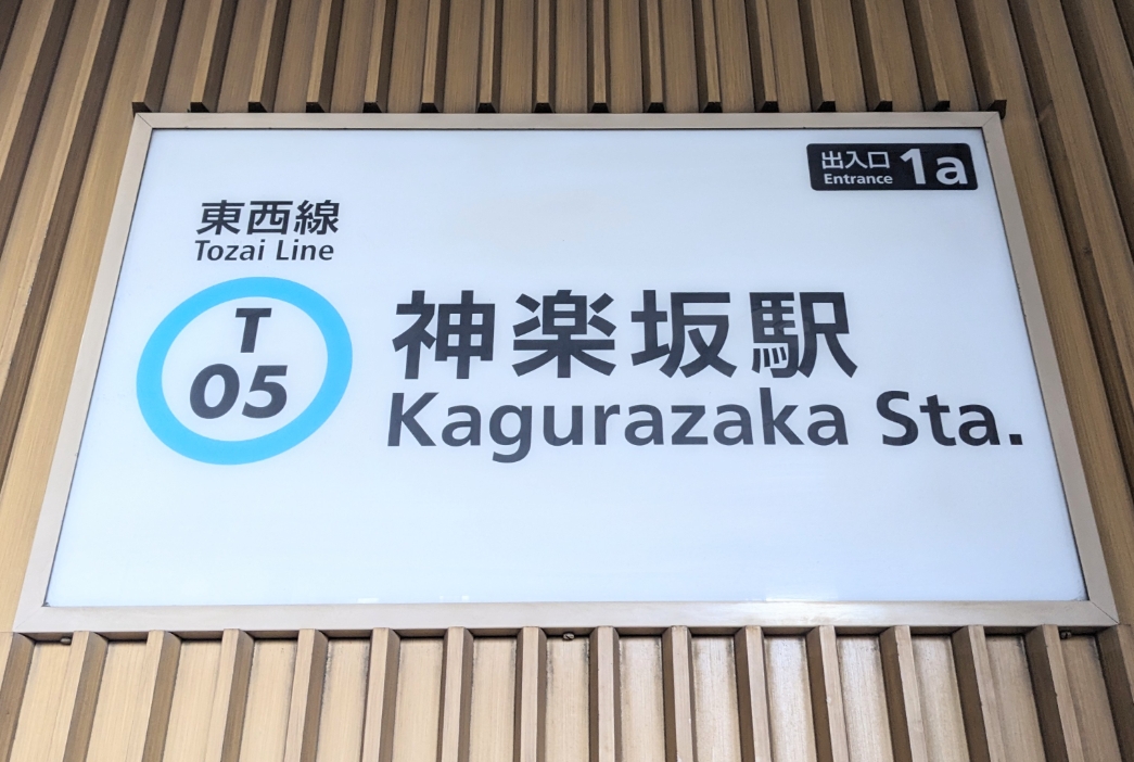 東京メトロ東西線、神楽坂駅の駅名標です。