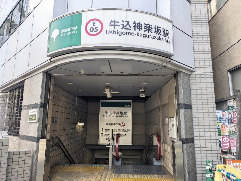 都営大江戸線牛込神楽坂駅の駅名看板です。