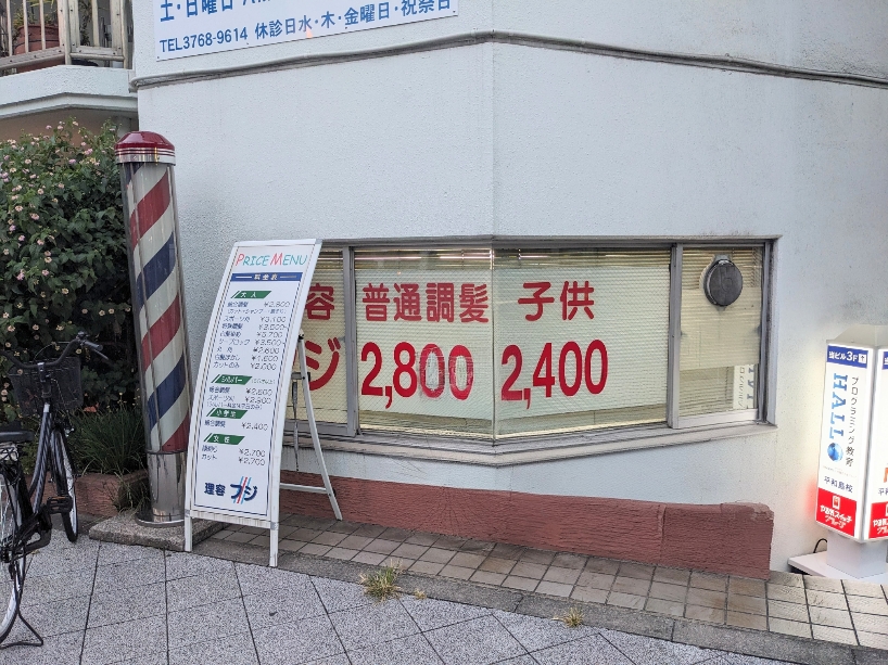 普通の理容店の内容で料金は2,800円ですが、カットも丁寧でシャンプーと髭剃りもやってもらいました。 お店は環七と第一京浜の交差点の角です。