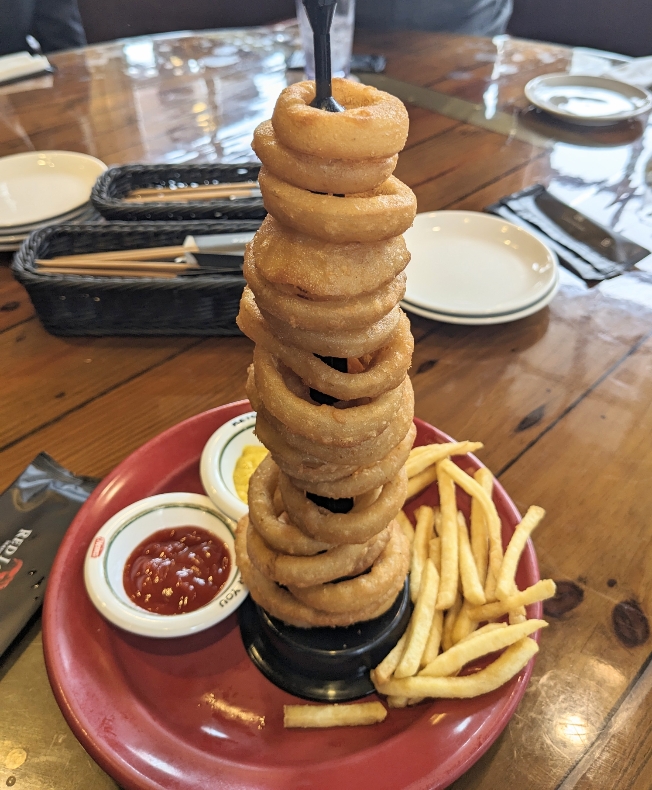 オニオンリングを高く積み上げた「オニオンツリー」です。オニオンリングは厚みもあって、食べ応えがあります。ケチャップとマスタードが付いてきます。