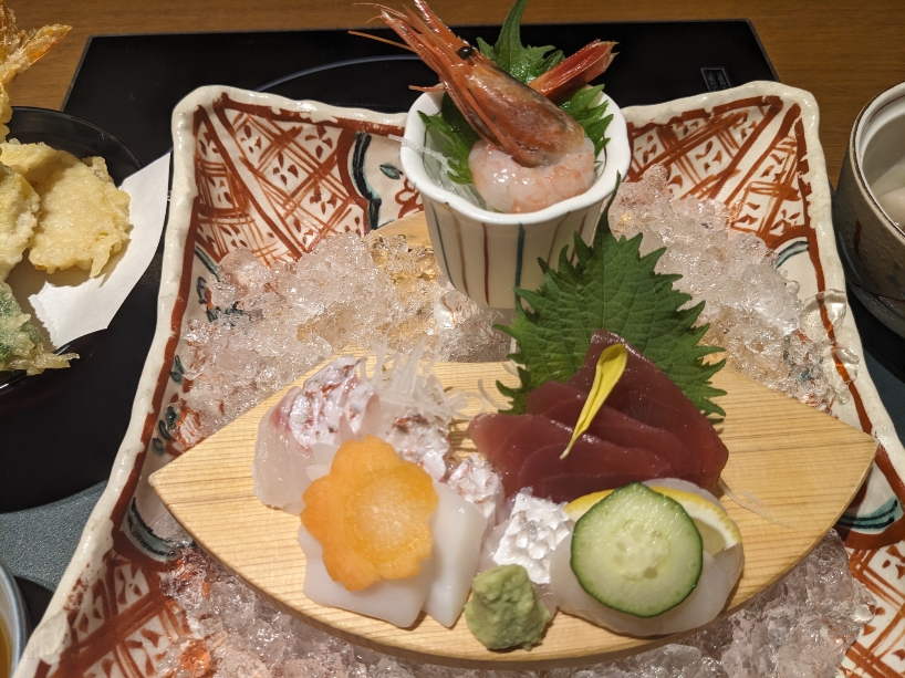 刺身です。まぐろ、鯛、いか、ホタテ、甘エビです。