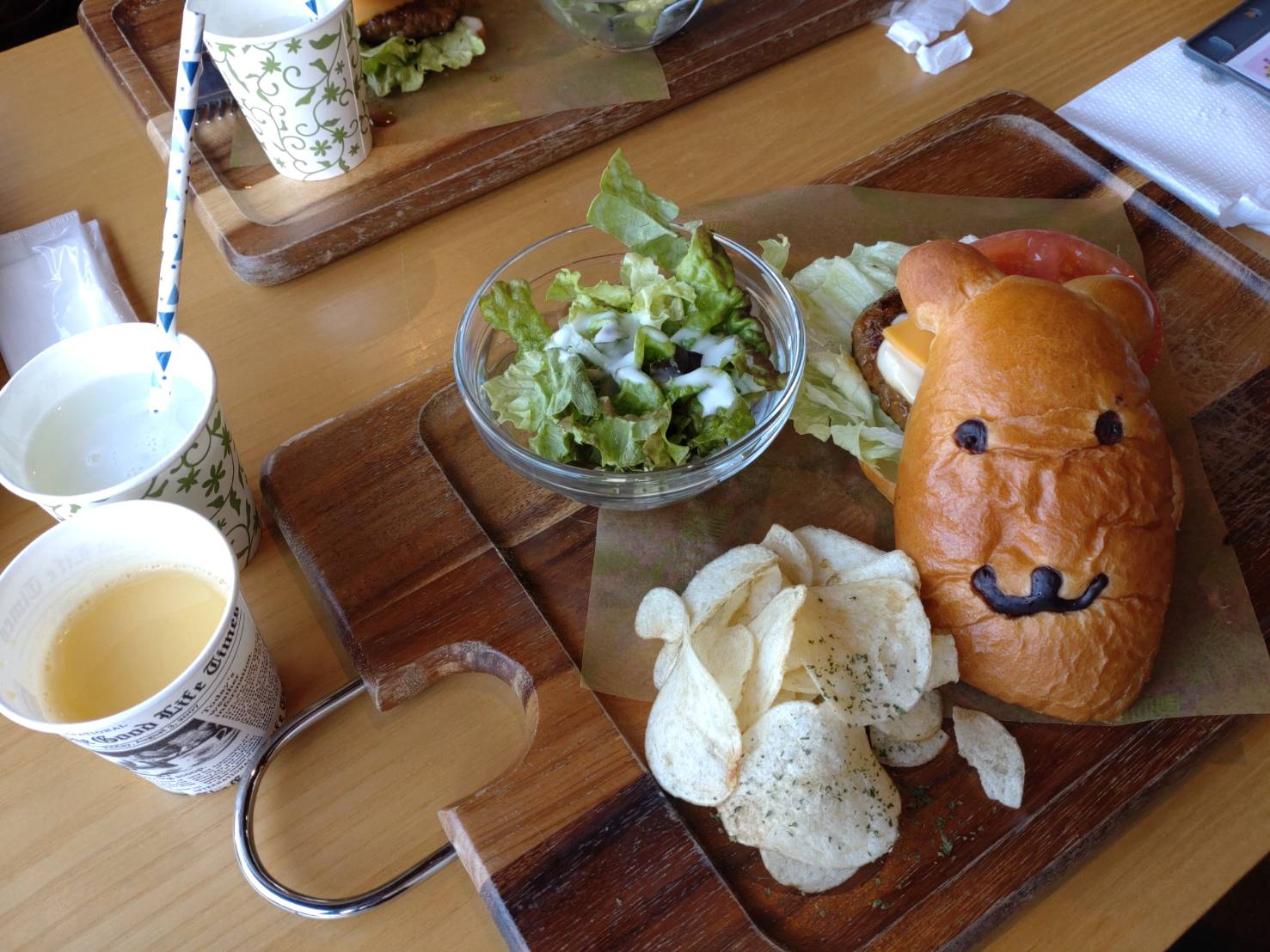 伊豆シャボテン動物公園内のレストラン。 カピバラの顔をしたハンバーガーのセット。