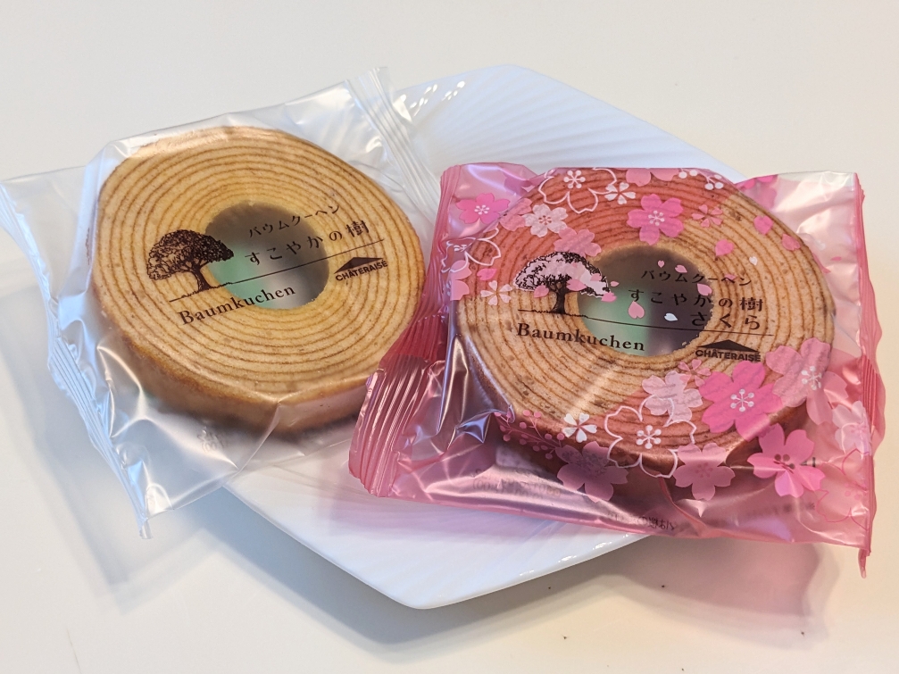 バウムクーヘンの「すこやかの樹」です。こちらは紅白詰め合わせです。手前のピンクは「さくら」です。紅白なので、ちょっとしたお祝いの贈り物にも使えます。