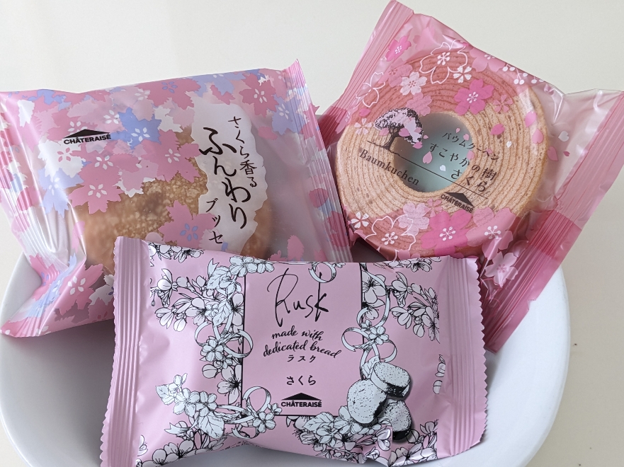 期間限定の春らしいさくらのお菓子たちです。「さくら香るふんわりブッセ」「ティータイムブレッド 春のさくらラスク」「バウムクーヘンすこやかの樹 さくら」です。