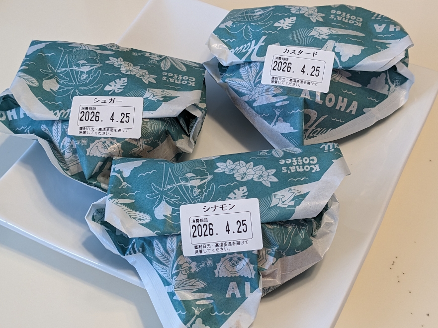 プレーンな「シュガー」、シナモンパウダーがかかっていて独特の味の「シナモン」、中にカスタードクリームが入っている「カスタード」です。