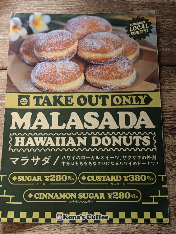 メニュー写真です。 マラサダはテイクアウトのみです。