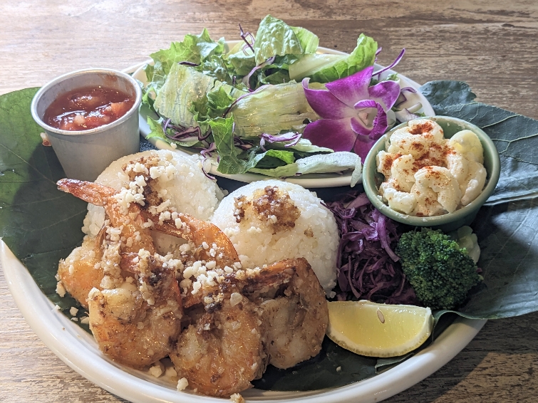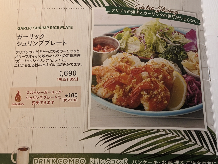 メニュー写真です。 「ガーリックシュリンププレート」¥1,859。 プリプリのエビをたっぷりのガーリックとオリーブオイルで炒めたハワイの定番料理「ガーリックシュリンプ」とライス。エビから出る旨みでオイルに深みがでます。