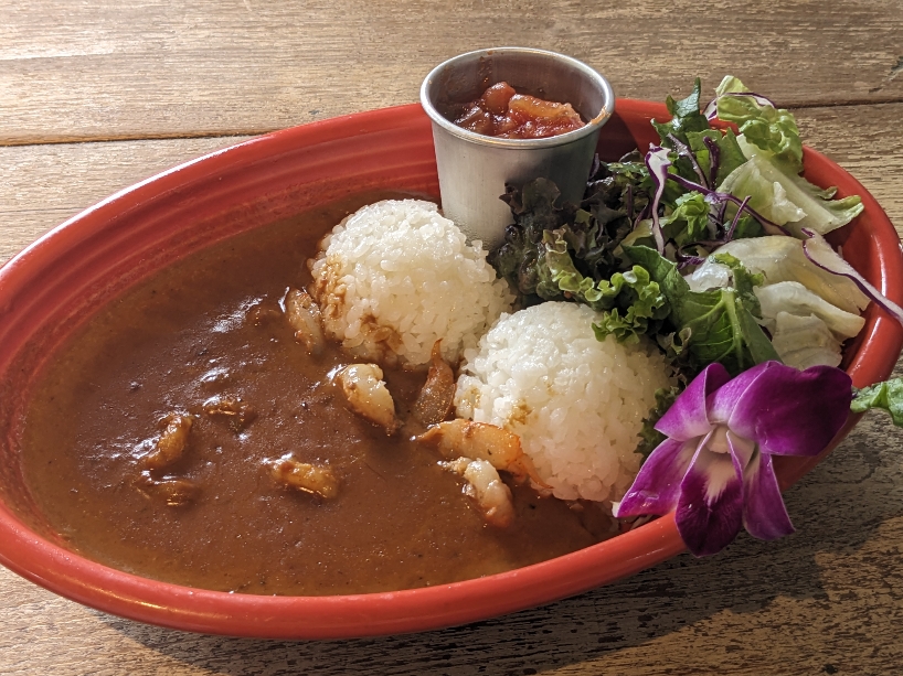 トマトココナッツカレーに、グリルされたエビがトッピングされている「グリルドシュリンプカレー」です。カレーはココナッツの甘味も感じられる、深みがあって美味しいものです。エビの大きさが予想より小さかったのが残念。