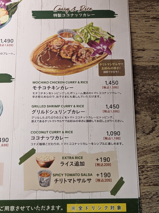 メニューです。 ●モチコチキンカレー ¥1,595 ●グリルドシュリンプカレー ¥1,595 ●ココナッツカレー ¥1,199