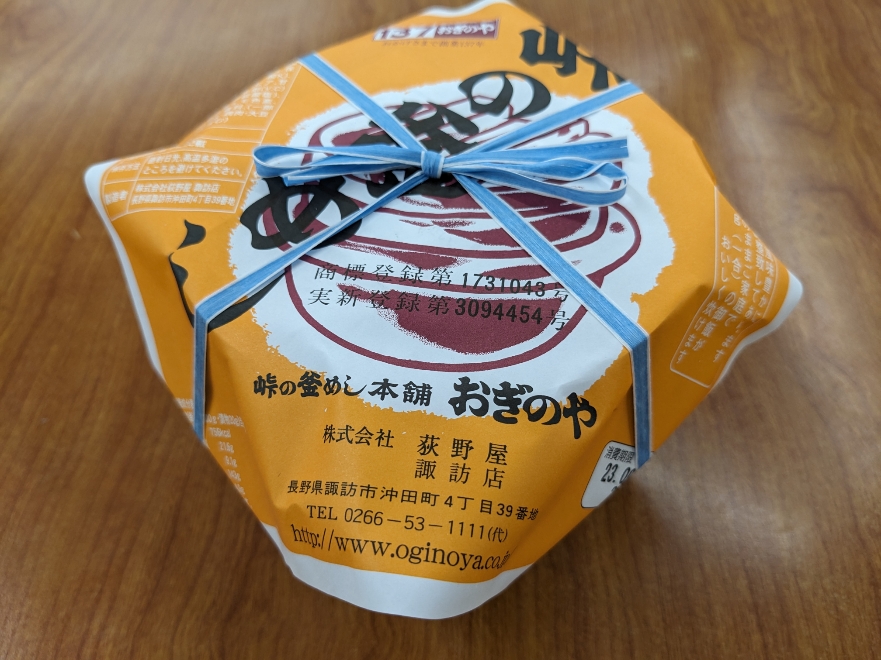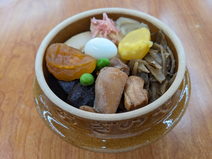 鶏肉、椎茸、ゴボウ、タケノコ、ウズラの卵、グリーンピース、栗、杏子。 昔から変わらない懐かしい釜めし。