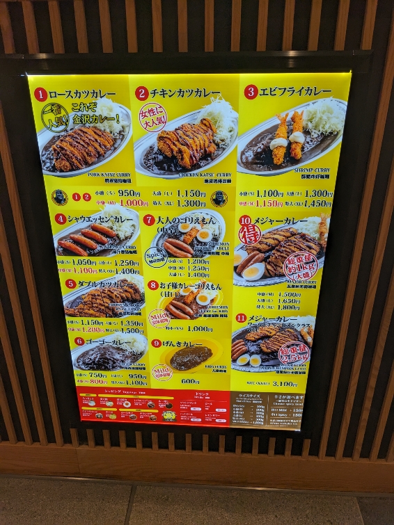 金沢カレーのメニュー ●ロースカツカレー ¥1,000 ●チキンカツカレー ¥1,000 ●エビフライカレー ¥1,450 ●シャウエッセンカレー ¥1,100 ●ダブルカツカレー ¥1,200 ●ゴーゴーカレー ¥800 ●大人のゴリえもん ¥1,250 ●お子様カレーゴリえもん ¥1,000 ●げんきカレー ¥600 ●メジャーカレー ¥1,500 ●メジャーカレー ワールドチャンピオンクラス ¥3,100