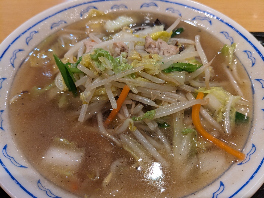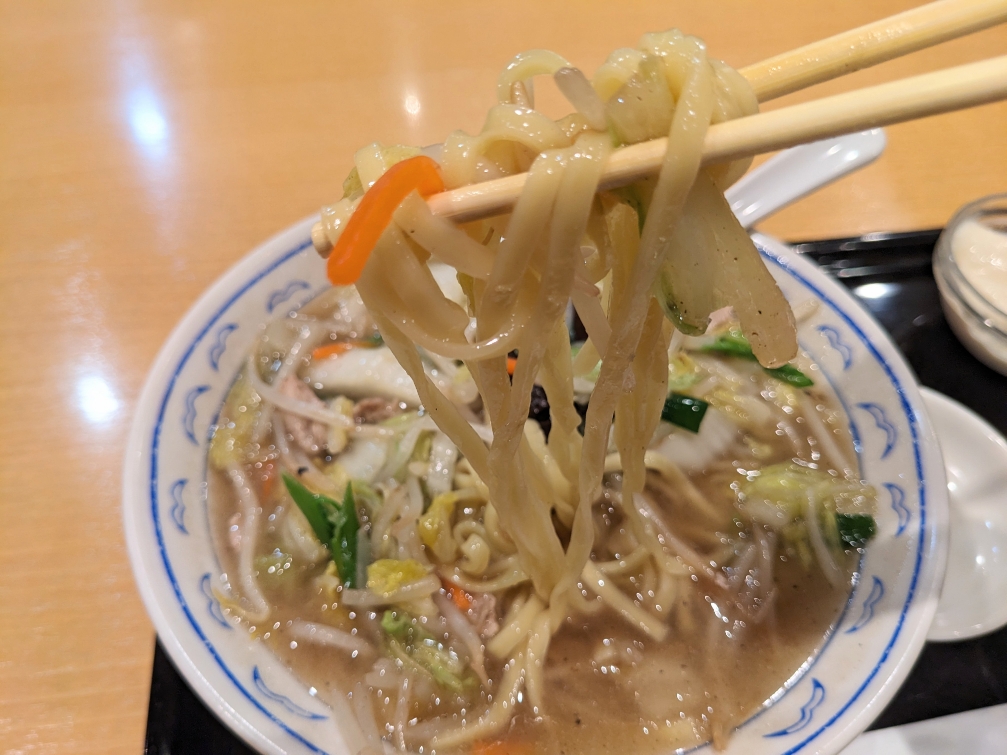 麺は平麺を使っているのが珍しいです。スープも塩味ですが、一般的なタンメンの白いものでなくて、茶色味がかっています。味わいの深いスープでした。絶品と名乗るのも理解できる美味しさでした。