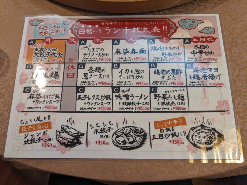 日替わりランチ献立表 (月)A.王家の大餃子定食 ¥890 B.油淋鶏 ¥950 C.麻婆かけご飯+ワンタンスープ ¥950 (水)A.ふわとろたまごのチリソース炒め ¥890 B.蒸鶏の葱ソースがけ ¥950 C.玉子レタス炒飯+ワンタンスープ ¥950 (木)A.麻婆春雨 ¥890 B.イカと葱のさっぱり炒め ¥950 C.味噌ラーメンと鉄鍋餃子 ¥950 (金)A.豚肉ともやし野菜炒め ¥890 B.鶏肉の黒酢すぶた ¥950 C.野菜たん麺と豚焼売 ¥950 (土日祝)A.本日の中華炒め ¥980 B.海老マヨと鶏唐揚げ ¥1,050