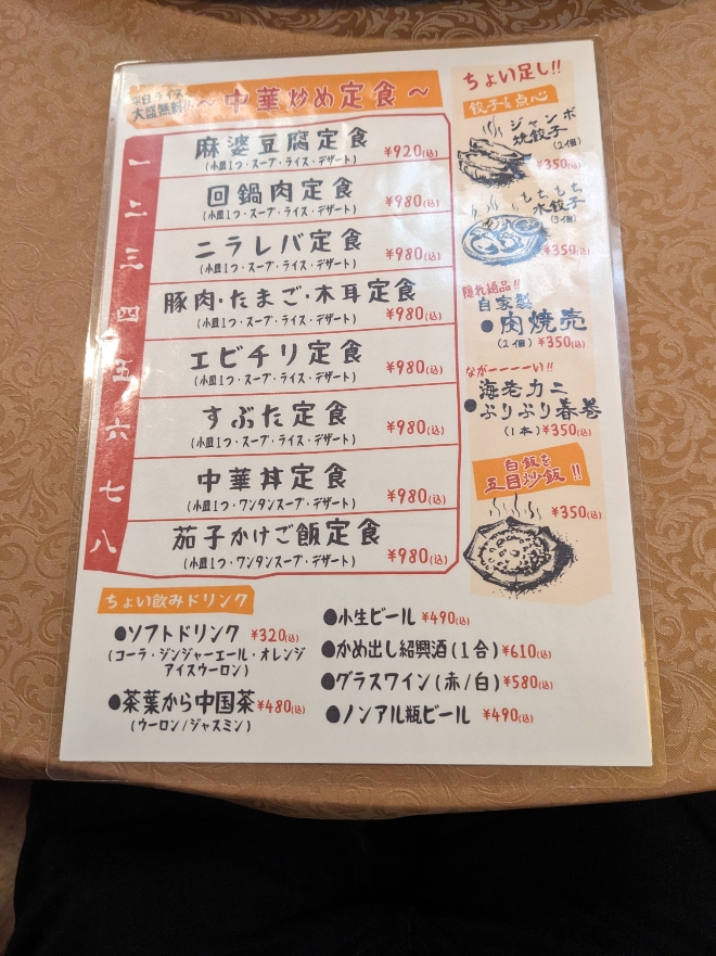 中華炒め定食 一.麻婆豆腐定食 ¥920 二.回鍋肉定食 ¥980 三.ニラレバ定食 ¥980 四.豚肉・たまご・木耳定食 ¥980 五.エビチリ定食 ¥980 六.すぶた定食 ¥980 七.中華丼定食 ¥980 八.茄子かけご飯定食 ¥980
