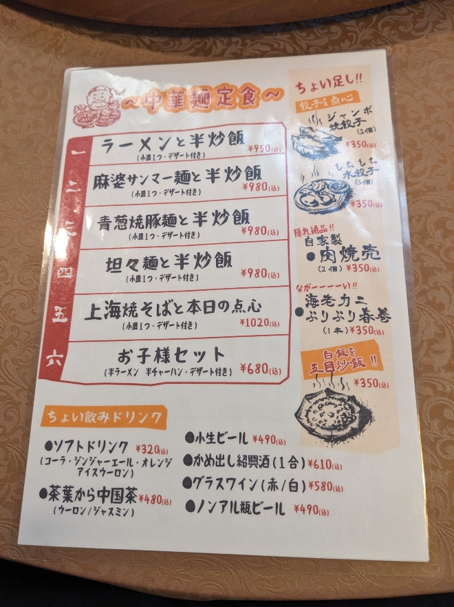 中華麺定食 一.ラーメンと半炒飯 ¥950 二.麻婆サンマー麺と半炒飯 ¥980 三.青葱焼豚麺と半炒飯 ¥980 四.担々麺と半炒飯 ¥980 五.上海焼そばと本日の点心 ¥1,020 六.お子様セット ¥680