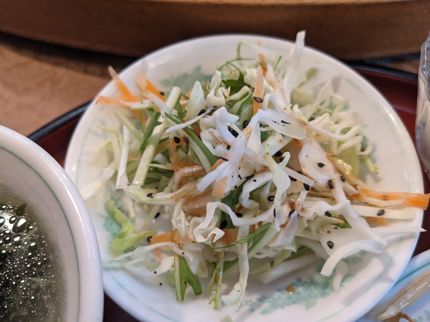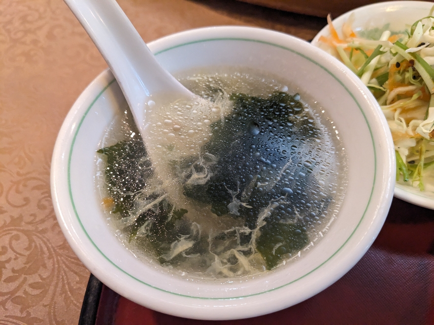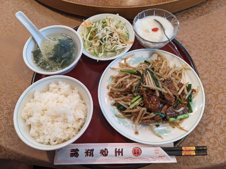 ランチの「ニラレバ定食」です。¥980。 スープ、サラダとデザートが付きます。