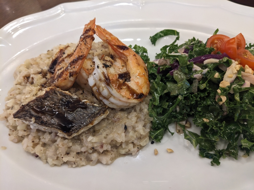 「シーフードグリル&ポルチーニクリームのリゾット仕立て」です。ポルチーニクリームのリゾットにグリルされた鯛と海老が乗っています。バルサミコソースも美味しい。ケールのサラダも美味しいです。