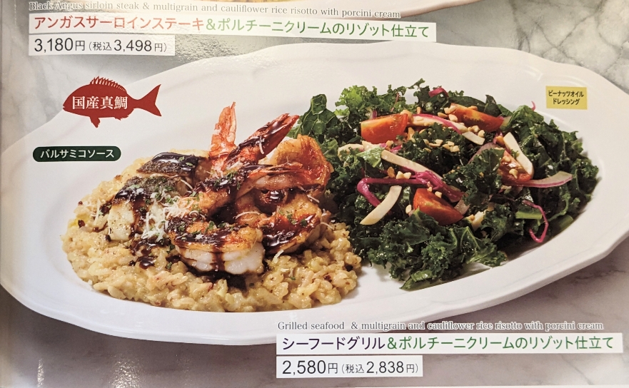 メニュー写真です。 「シーフードグリル&ポルチーニクリームのリゾット仕立て」¥2838です。