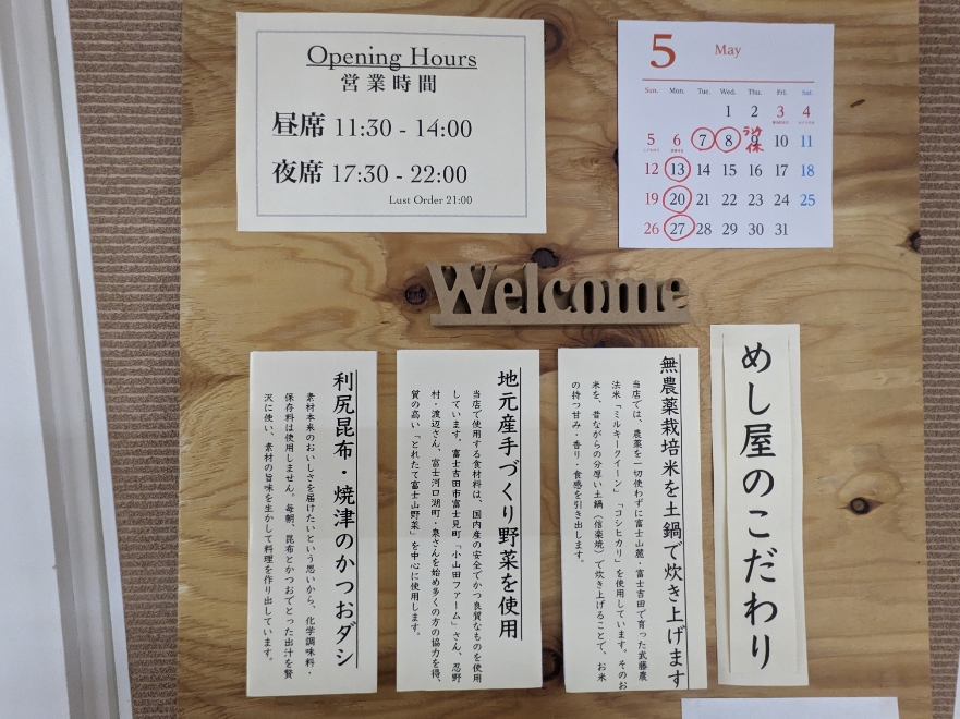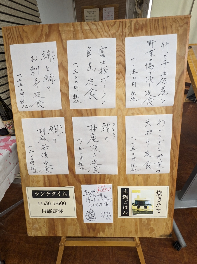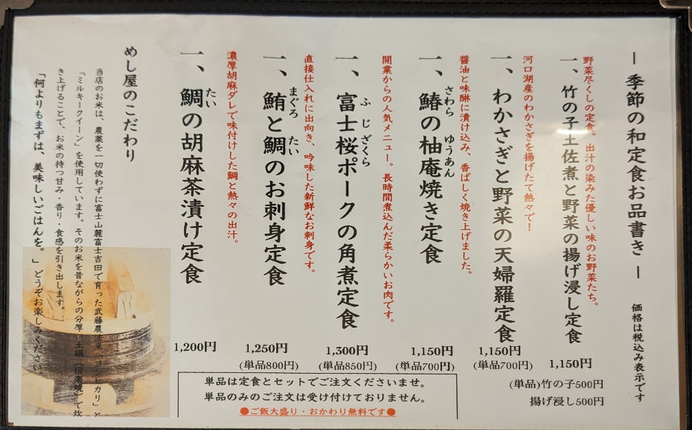 店頭のメニュー ●竹の子土佐煮と野菜揚げ浸し定食 ¥1,150 ●わかさぎと野菜の天ぷら定食 ¥1,150 ●富士桜ポークの角煮定食 ¥1,300 ●鰆の柚庵焼き定食 ¥1,150 ●鮪と鯛の刺身定食 ¥1,250 ●鯛の胡麻茶漬け定食 ¥1,200