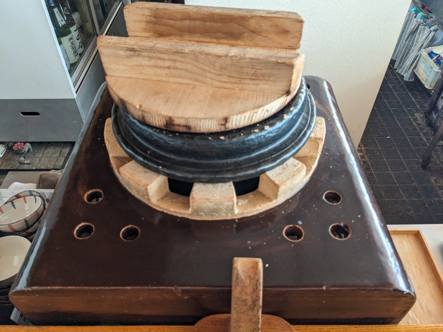 店内から調理用の土鍋が見えました。
