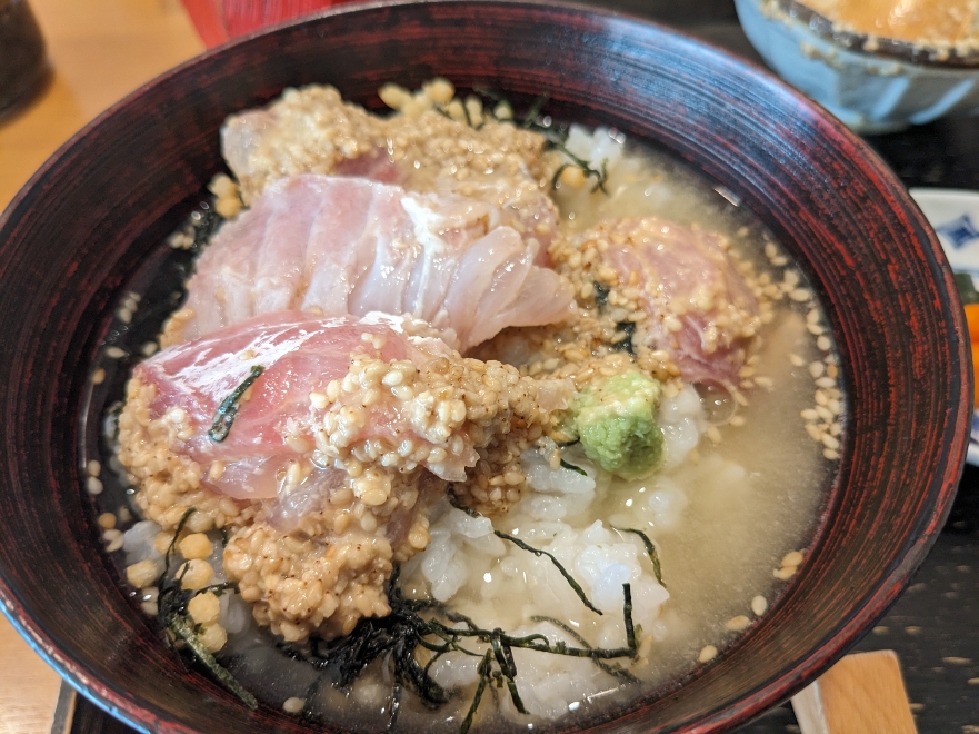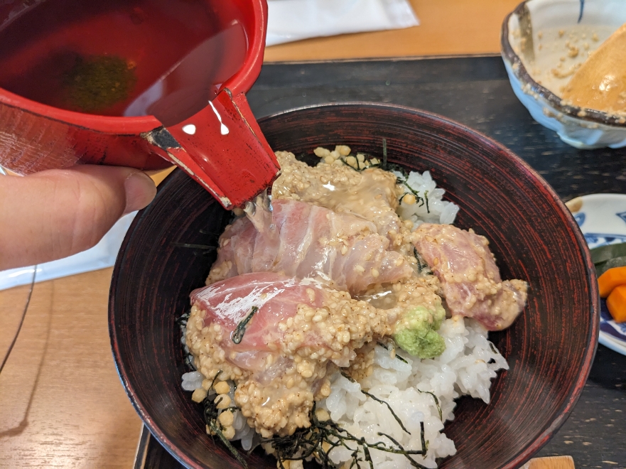 この鯛を刻み海苔がたっぷりと乗ったご飯に載せて、そこへ出し汁を注ぎます。