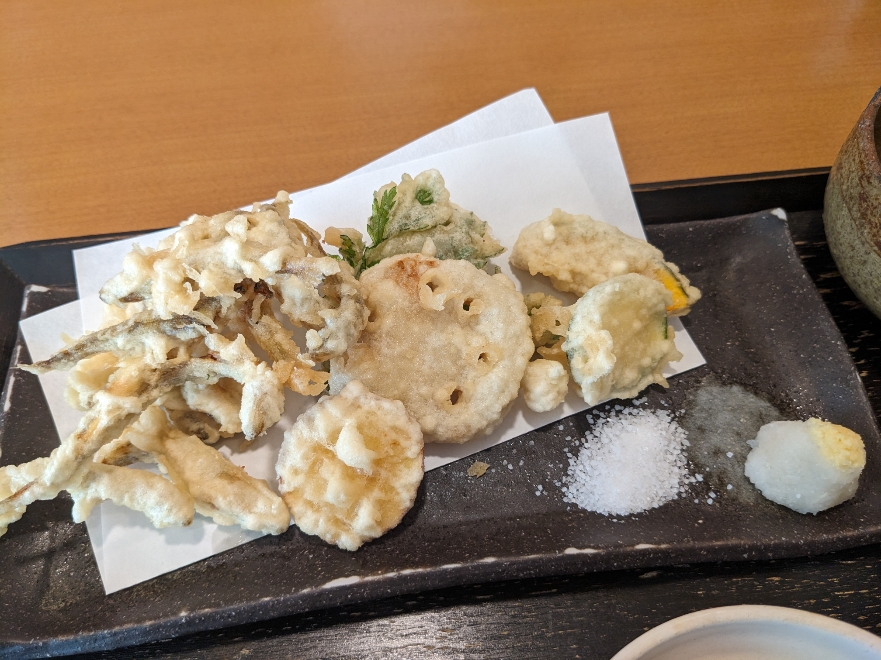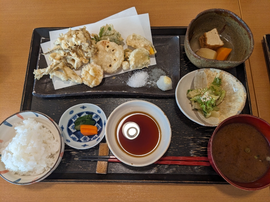 わかさぎと野菜の天ぷら定食です。天ぷらはお好みで、塩でも天つゆでも食べられます。