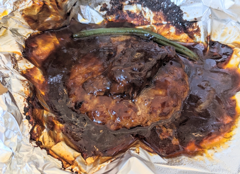 アルミホイルを開くと、濃厚なビーフシチューで味付けされたハンバーグが出てきます。