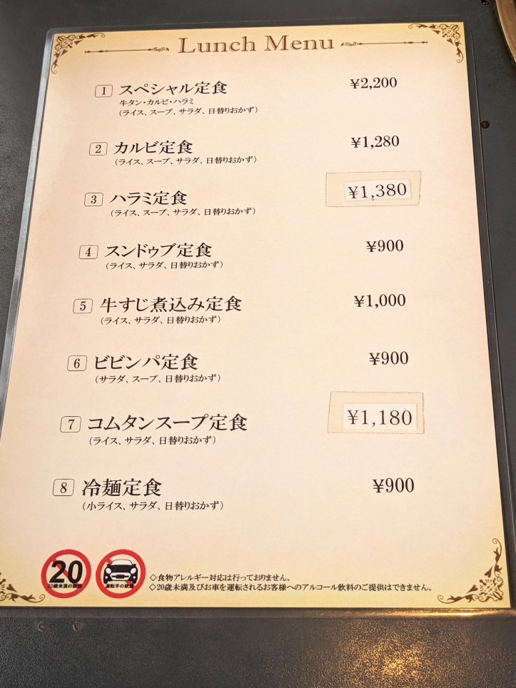 1.スペシャル定食 ¥2,200 2.カルビ定食 ¥1,280 3.ハラミ定食 ¥1,380 4.スンドゥブ定食 ¥900 5.牛すじ煮込み定食 ¥1,000 6.ビビンパ定食 ¥900 7.コムタンスープ定食 ¥1,180 8.冷麺定食 ¥900