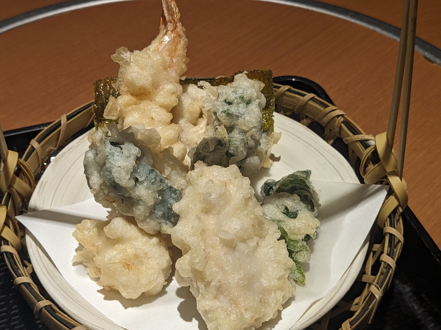 野菜天ぷらです。中身はナス、レンコン、ししとう、かぼちゃ、海苔です。
