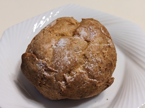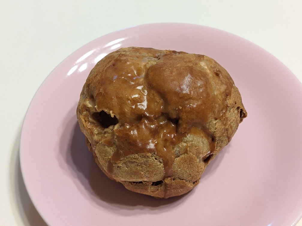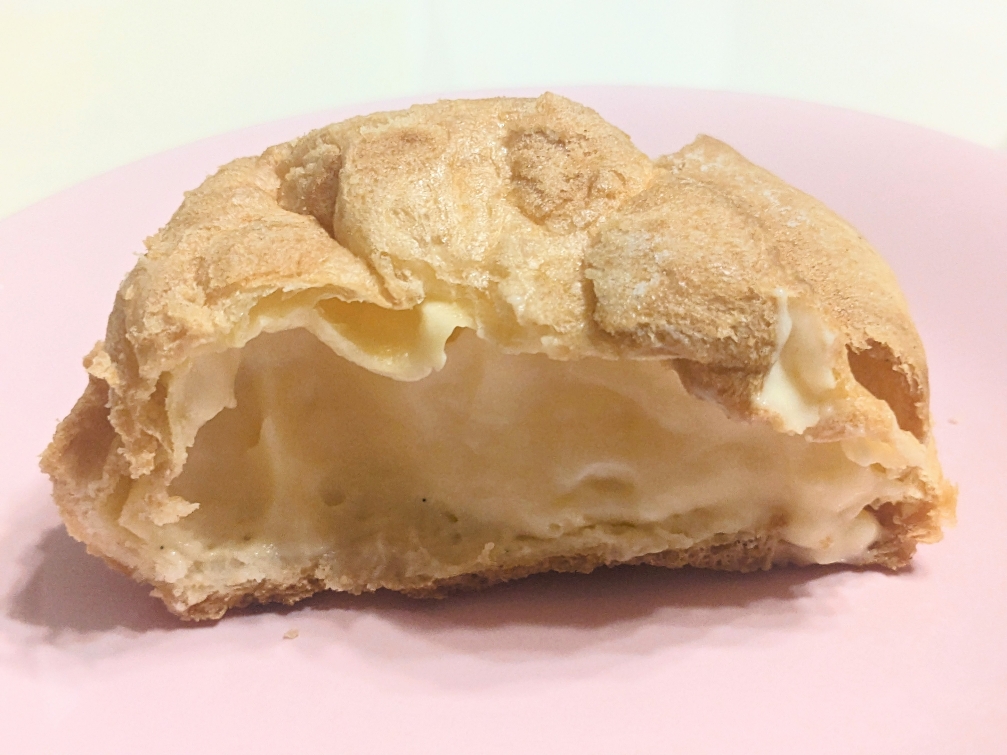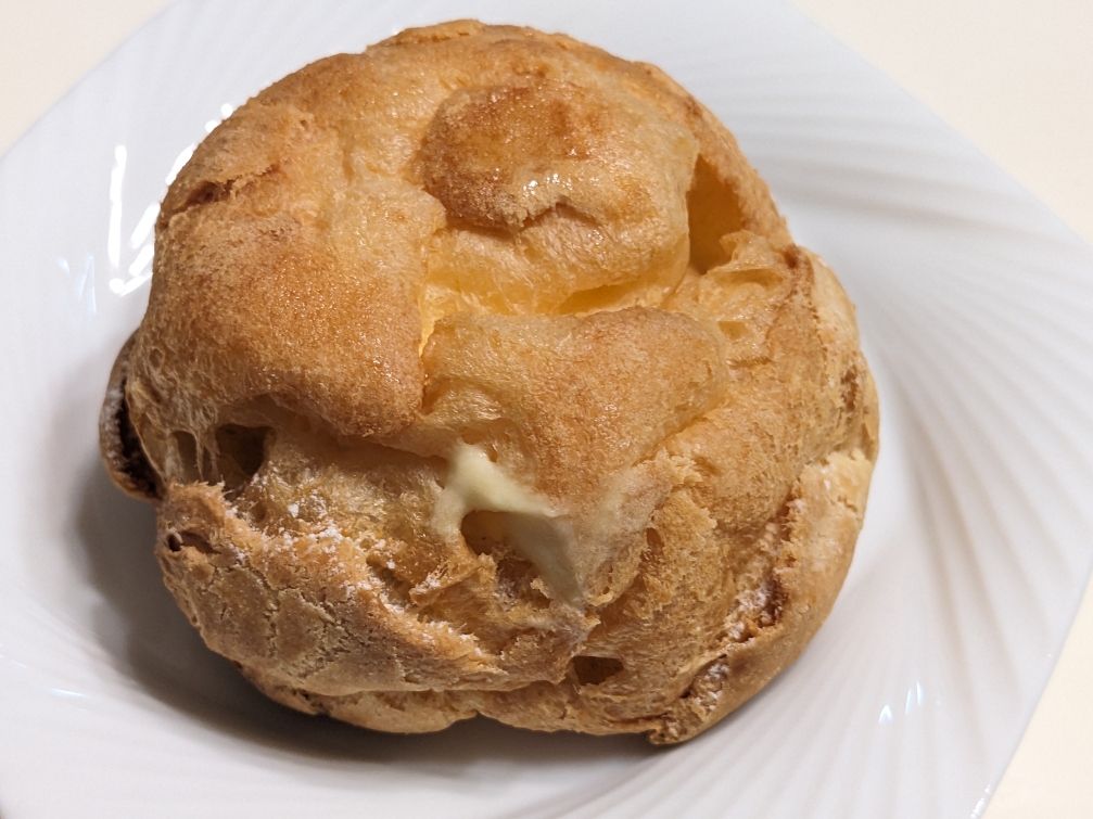 定番のクッキーシューです。クッキー生地がトッピングされていて、サクサク感がアップしています。中身はカスタードクリームです。