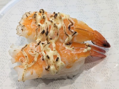 「炙りえびマヨ」¥110です。マヨネーズをかけて、炙ってあるので香ばしく美味しいです。