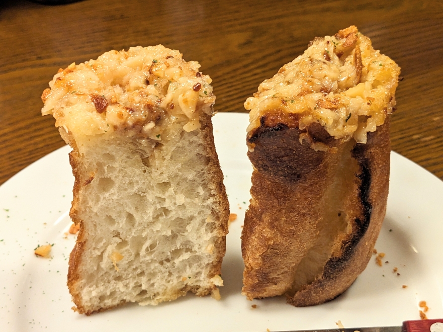 フランスパンにガーリックたっぷりのソースが乗っています。