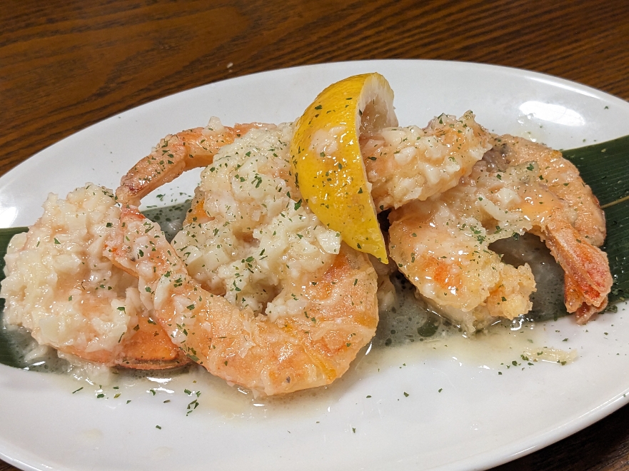 カラッと揚げたエビにガーリックソースで味付けされています。