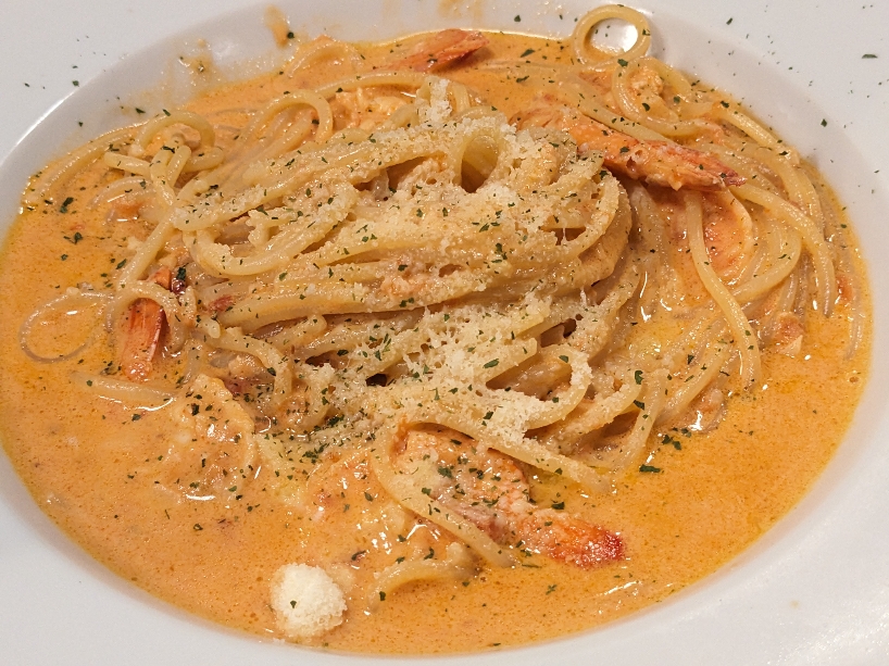 海老もたっぷりと入ったトマトクリームソースのパスタです。美味しいパスタです。
