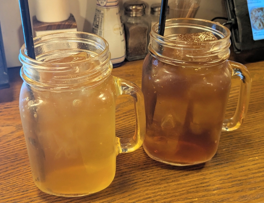 ドリンクです。 右が黒烏龍茶、左がアイスマンゴージャスミンティです。本当に甘いマンゴーの香りがします。珍しいテイストです。