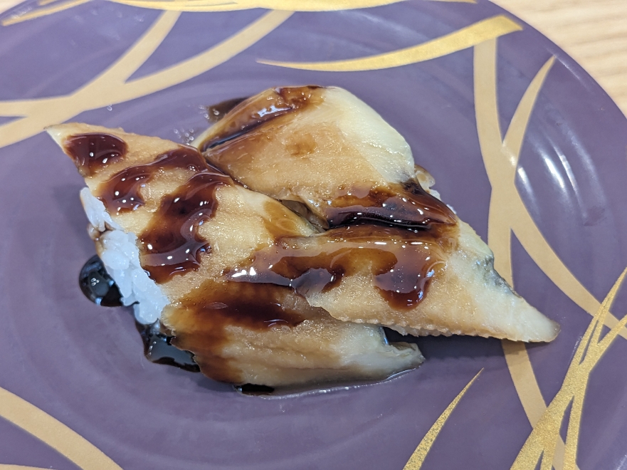 平貝の磯辺焼きです。少し小振りではありますが、気の利いた寿司屋でしか見かけないようなネタが回転寿司で食べられようとは。