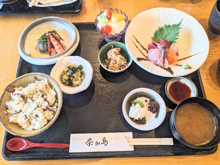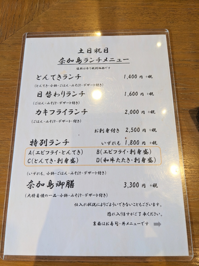 ●とんてきランチ 1,400円+税 ●日替わりランチ 1,600円+税 ●カキフライランチ 2,000円+税 お刺身付き 2,500円+税 ●特別ランチ いずれも1,800円+税 A(エビフライ・とんてき) B(エビフライ・刺身盛) C(とんてき・刺身盛) D(和牛たたき・刺身盛) ●奈加島御膳 3,300円+税