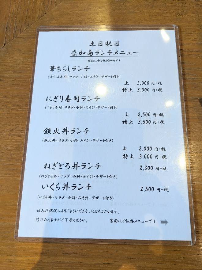 ●華ちらしランチ 上 2,000円+税 特上 3,000円+税 ●にぎり寿司ランチ 上 2,500円+税 特上 3,500円+税 ●鉄火丼ランチ 上 2,000円+税 特上 3,000円+税 ●ねぎとろ丼ランチ 2,300円+税 ●いくら丼ランチ 2,500円+税
