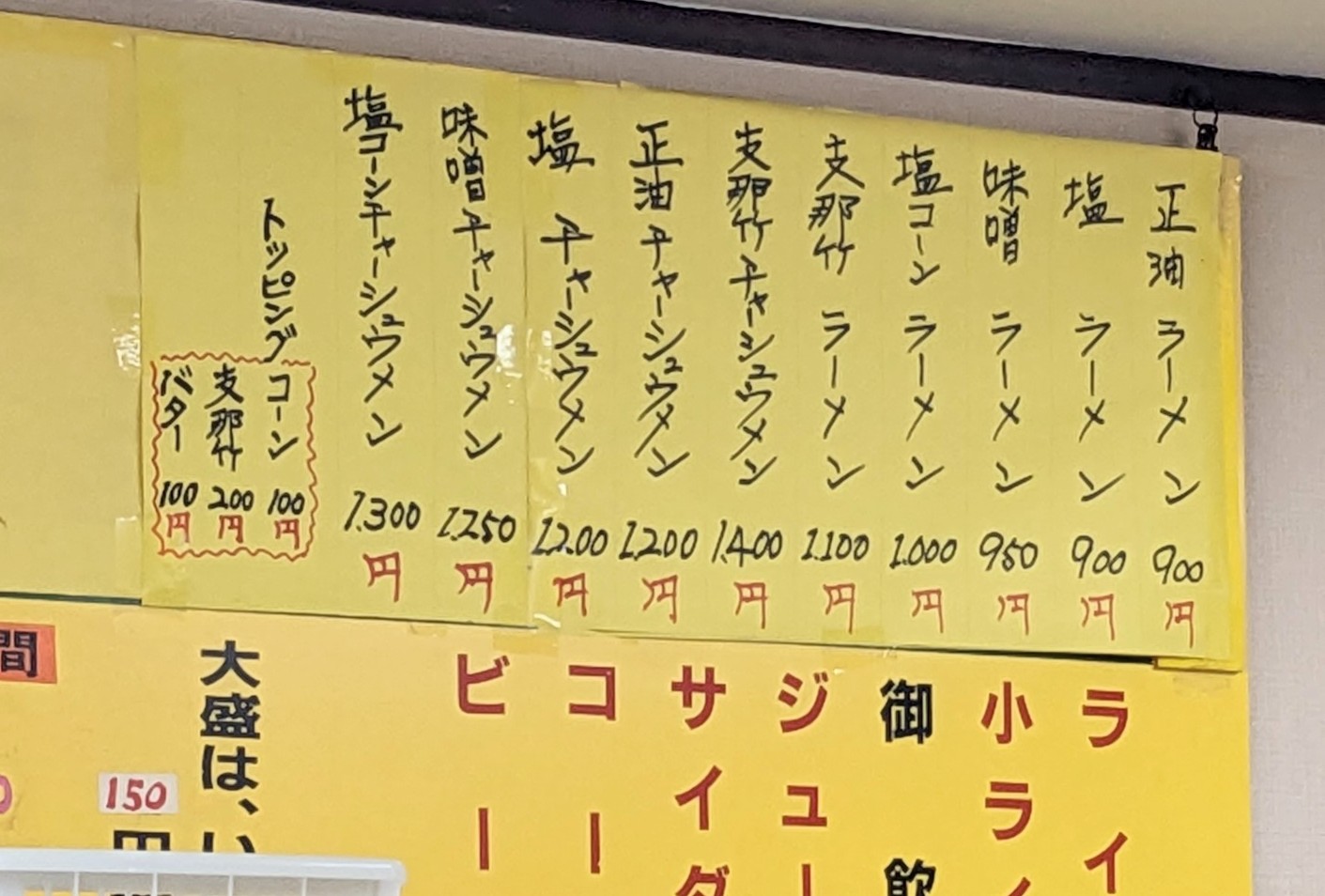 基本的に正油、塩、味噌の3種類です。それにチャーシュー、支那竹、コーンのトッピングがあります。