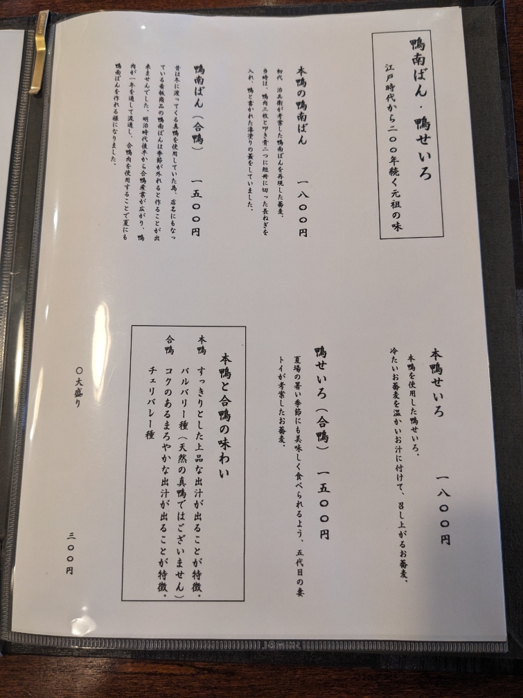 ●鴨南ばん(合鴨) 1500円 昔は冬に渡ってくる真鳴を使用していた為、店名にもなっている看板商品の鴨南ばんは季節が外れると作ることが出来ませんでした。明治時代後半から合鴨産業が広がり、鳴肉が一年を通して流通し、合鴨肉を使用することで夏にも鴨南ばんを作れる様になりました。