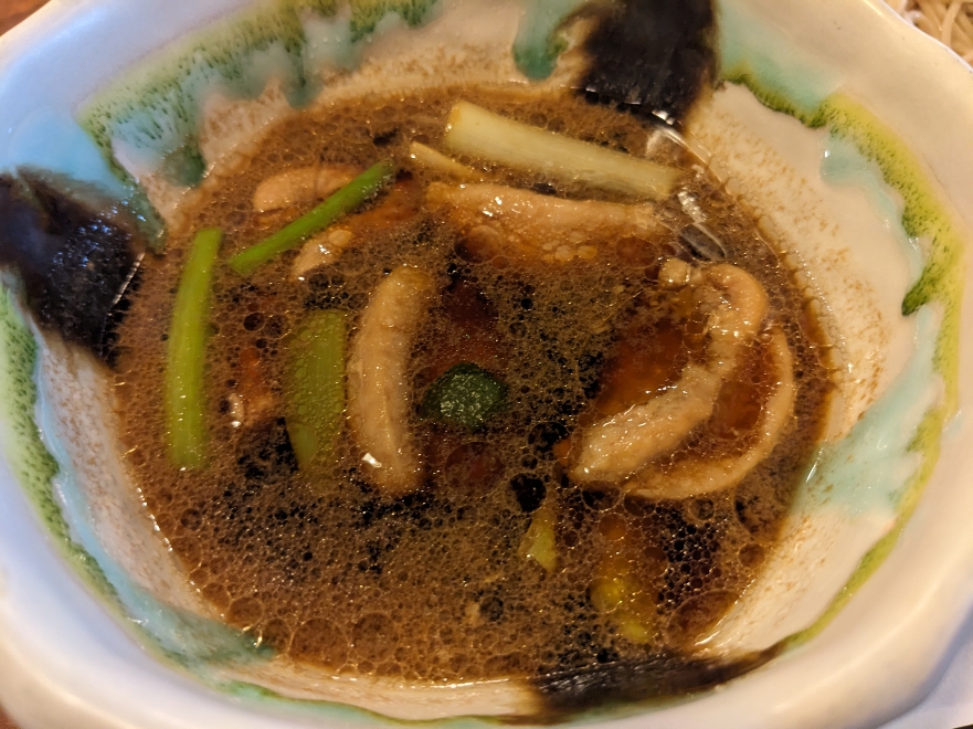 鴨南蛮のつけ汁です。しっかりとした締まった鴨肉も結構入っています。