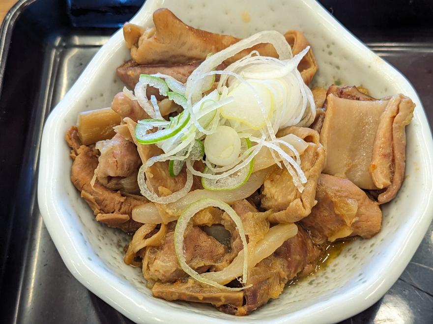 山田うどん名物の「パンチ」。もつ煮込みです。メンマが入っていて、シャキシャキ感があるのが特長です。写真は130gのミニパンチです。