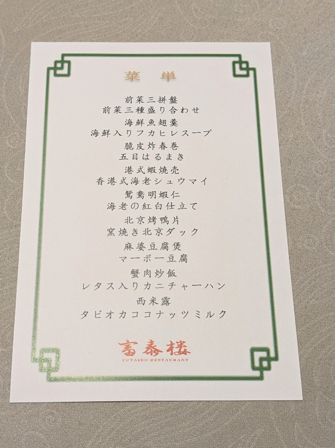 ●前菜三種盛り合わせ ●海鮮入りフカヒレスープ ●五目はるまき ●香港式海老シュウマイ ●海老の紅白仕立て ●窯焼き北京ダック ●マーボー豆腐 ●レタス入りカニチャーハン ●タピオカココナッツミルク